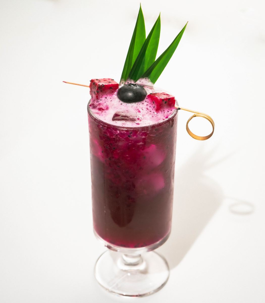 - Cho siro việt quất, thanh long ruột đỏ, nước chanh và nước đường vào ly.