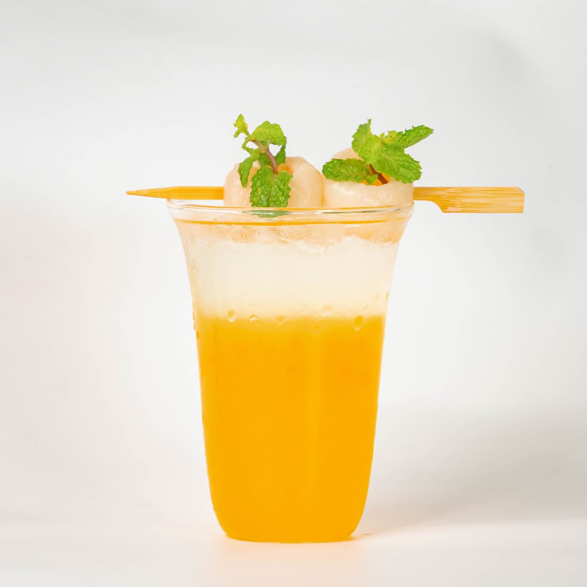 -Cho lần lượt siro vải, nước đường, nước ép chanh dây và đá bi vào ly (hoặc bình lắc).